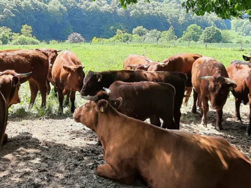 Als Mutterkühe ziehen unsere Kühe ihre Kälber selber auf und genießen mit ihnen das besonders artgerechte Leben. Sie fressen ausschließlich das Gras und die Kräuter unserer Wiesen, im Winter als Heu oder Silage. So können unsere Rinder langsam und behutsam wachsen, was sich auch in der Fleischqualität bemerkbar macht.